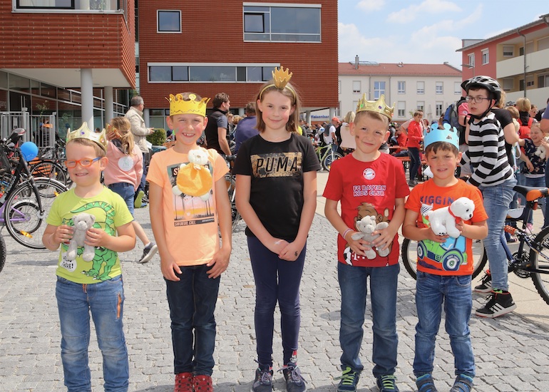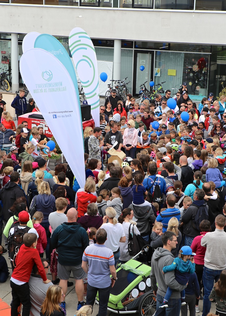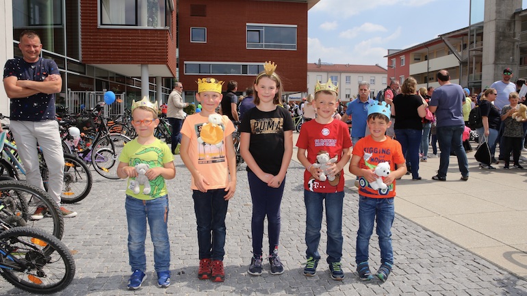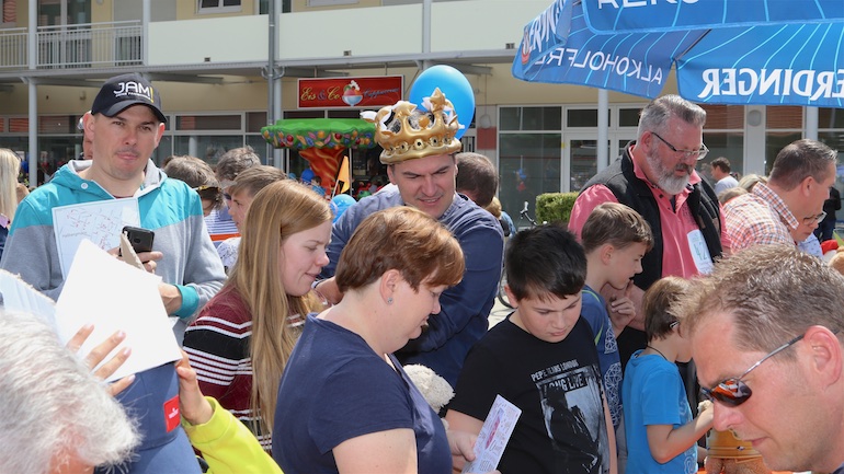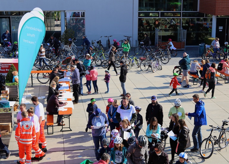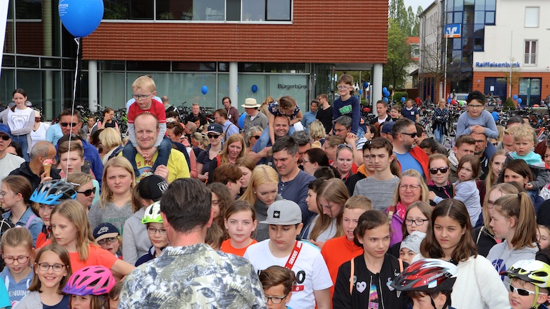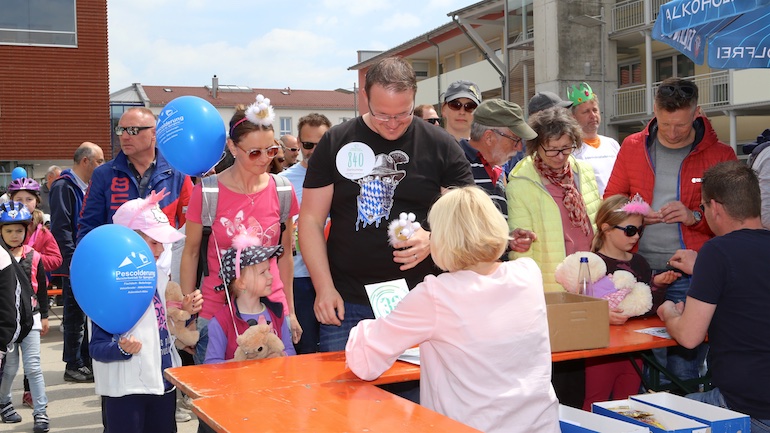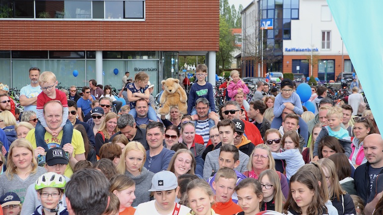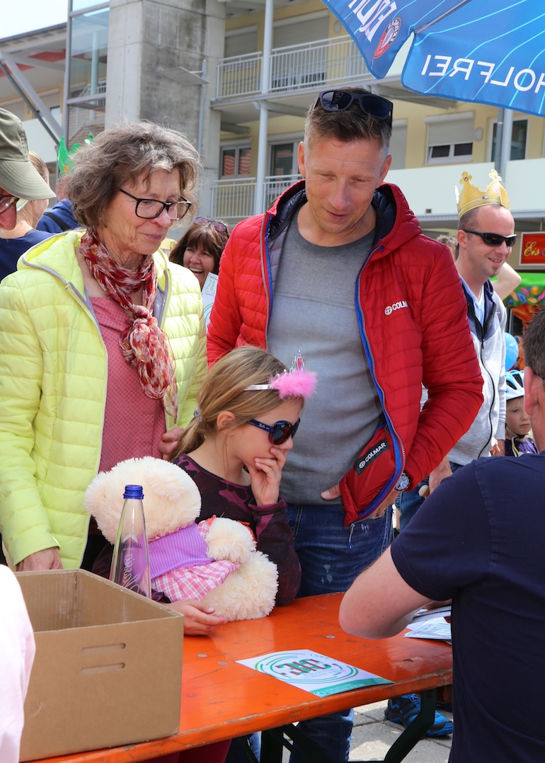 Am 1. Mai ist natürlich Feiertag, aber auch ein anderer fester Termin steht in den Kalendern vieler Familien in Hallbergmoos und Goldach. Denn immer dann startet die beliebte Radlrallye der Werbegemeinschaft Hallbergmoos in Aktion durch den Ort. Schon früh am Morgen, um 9.00 Uhr, fuhren Hunderte Radler Richtung Rathausplatz, um sich die Starterkarten und den Streckenplan abzuholen. In diesem Jahr wurden so viele Startnummern wie nie zuvor auf Rücken, Brust oder auf die Radl der Teilnehmer geklebt. Sage und schreibe 943 Radelbegeisterte strampelten dann gemeinsam durch den Ort, um die vielen Lösungsbuchstaben zu bekommen, die in diesem Jahr einen totalen Buchstabensalat ergeben sollten. Nach schon fünf beantworteten Fragen, die als Plakate an den jeweiligen Türen der aktuell 71 Mitgliedsbetriebe hangen, standen in manchen Gesichtern der Teilnehmer Fragezeichen geschrieben. Denn der Lösungssatz sollte einfach keinen sichtbaren Sinn ergeben. Die Auflösung bekam man erst, wenn im Ziel eine Schablone, von den Vorstandsmitgliedern der Werbegemeinschaft, über das Durcheinander an Buchstaben gelegt wurde. Insgesamt 943 Mal kam dann der Satz „Alles Gute zum Dreißigsten“ zum Vorschein. Über den ein oder anderen kleineren Schreibfehler sah man angesichts des großen Jubiläums der Werbegemeinschaft Hallbergmoos in Aktion gern hinweg. Denn es gab dazu ja noch ein Geburtstagsständchen der mit vielen lustigen und auch selbst gebastelten Kronen ausgestatteten Teilnehmer dazu. Auch das Maskottchen, der Hallbär, hatte viel zu schauen. Hunderte große und kleine Bären, ob angemalt, verkleidet, in Form von Gummibären oder als süße Plüschvariante gab es da zu sehen. Dies waren die drei Sachen, die man zum abgestempelten Fahrplan mit zum Rathausplatz bringen musste. Erst dann gelangten die Lösungskarten in die neue Lostrommel, die die Schreinerei Wittmann extra