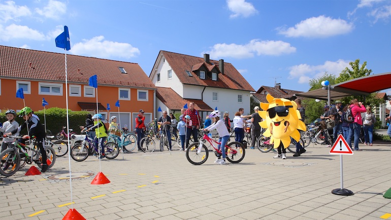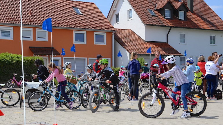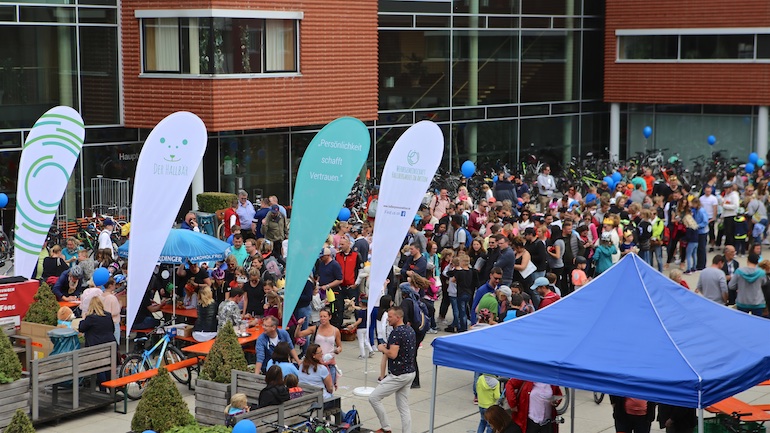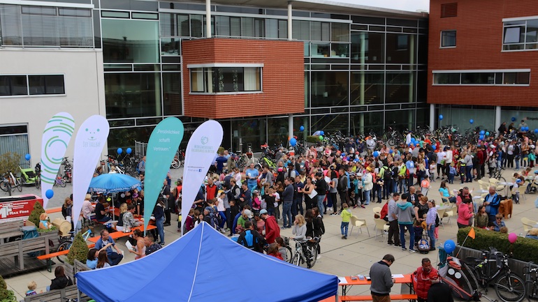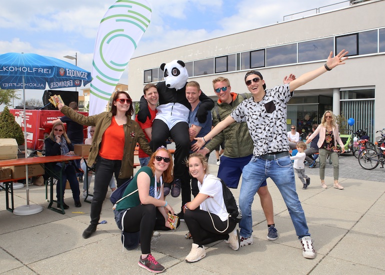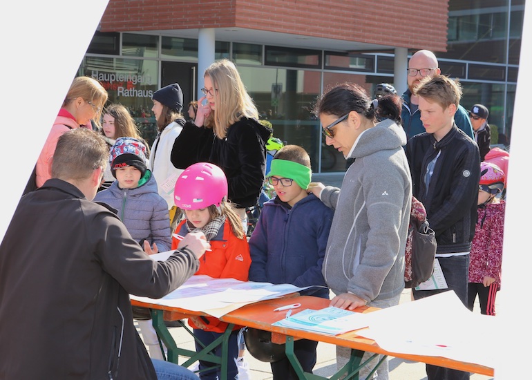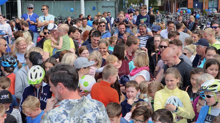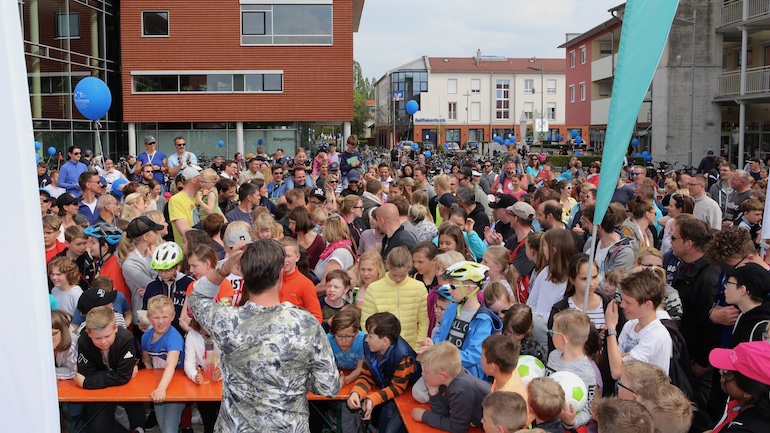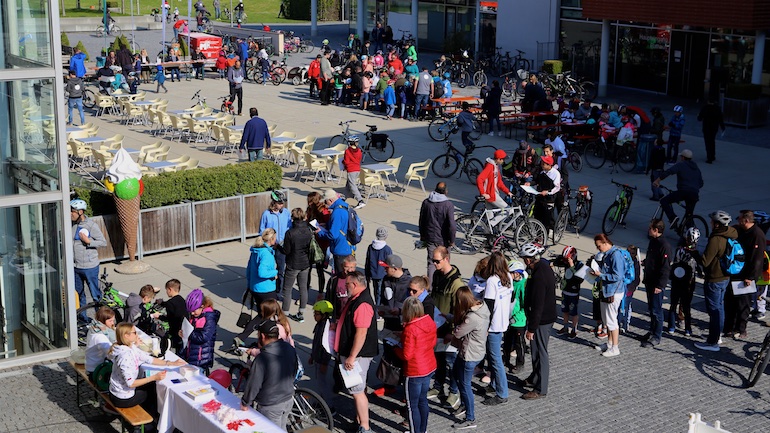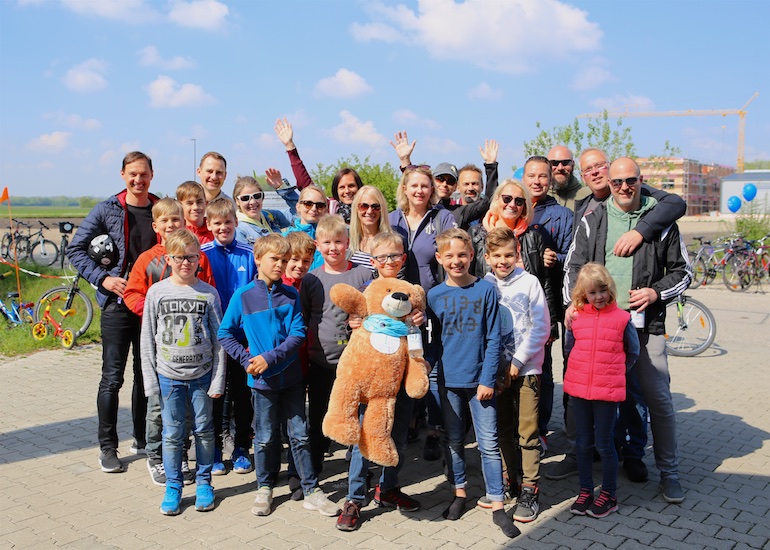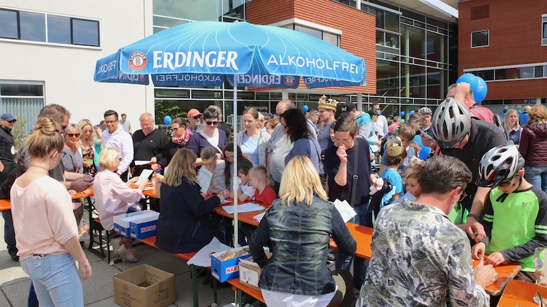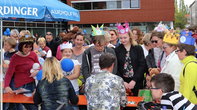 Am 1. Mai ist natürlich Feiertag, aber auch ein anderer fester Termin steht in den Kalendern vieler Familien in Hallbergmoos und Goldach. Denn immer dann startet die beliebte Radlrallye der Werbegemeinschaft Hallbergmoos in Aktion durch den Ort. Schon früh am Morgen, um 9.00 Uhr, fuhren Hunderte Radler Richtung Rathausplatz, um sich die Starterkarten und den Streckenplan abzuholen. In diesem Jahr wurden so viele Startnummern wie nie zuvor auf Rücken, Brust oder auf die Radl der Teilnehmer geklebt. Sage und schreibe 943 Radelbegeisterte strampelten dann gemeinsam durch den Ort, um die vielen Lösungsbuchstaben zu bekommen, die in diesem Jahr einen totalen Buchstabensalat ergeben sollten. Nach schon fünf beantworteten Fragen, die als Plakate an den jeweiligen Türen der aktuell 71 Mitgliedsbetriebe hangen, standen in manchen Gesichtern der Teilnehmer Fragezeichen geschrieben. Denn der Lösungssatz sollte einfach keinen sichtbaren Sinn ergeben. Die Auflösung bekam man erst, wenn im Ziel eine Schablone, von den Vorstandsmitgliedern der Werbegemeinschaft, über das Durcheinander an Buchstaben gelegt wurde. Insgesamt 943 Mal kam dann der Satz „Alles Gute zum Dreißigsten“ zum Vorschein. Über den ein oder anderen kleineren Schreibfehler sah man angesichts des großen Jubiläums der Werbegemeinschaft Hallbergmoos in Aktion gern hinweg. Denn es gab dazu ja noch ein Geburtstagsständchen der mit vielen lustigen und auch selbst gebastelten Kronen ausgestatteten Teilnehmer dazu. Auch das Maskottchen, der Hallbär, hatte viel zu schauen. Hunderte große und kleine Bären, ob angemalt, verkleidet, in Form von Gummibären oder als süße Plüschvariante gab es da zu sehen. Dies waren die drei Sachen, die man zum abgestempelten Fahrplan mit zum Rathausplatz bringen musste. Erst dann gelangten die Lösungskarten in die neue Lostrommel, die die Schreinerei Wittmann extra
