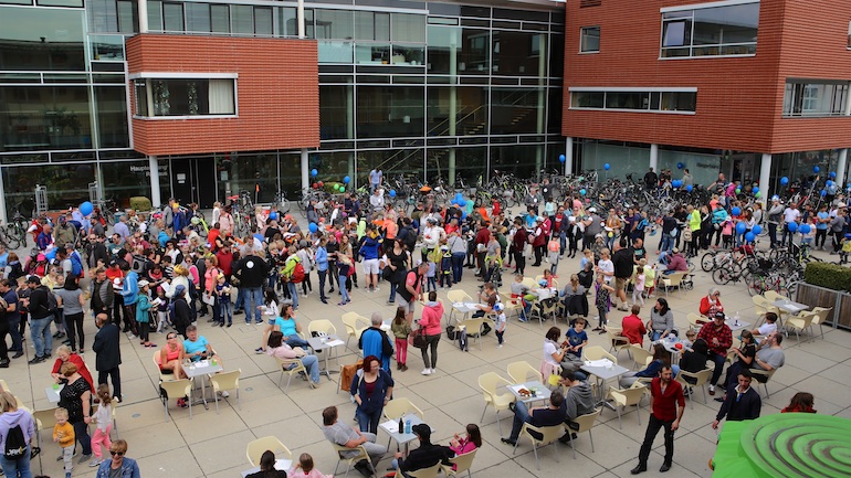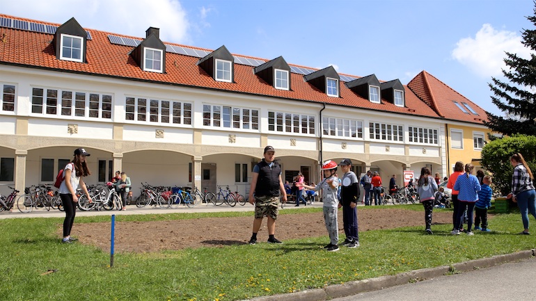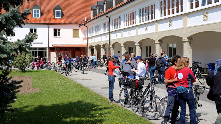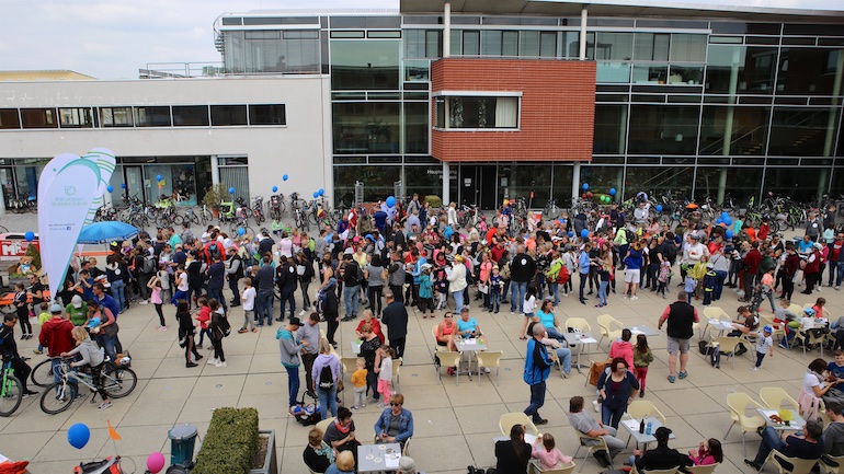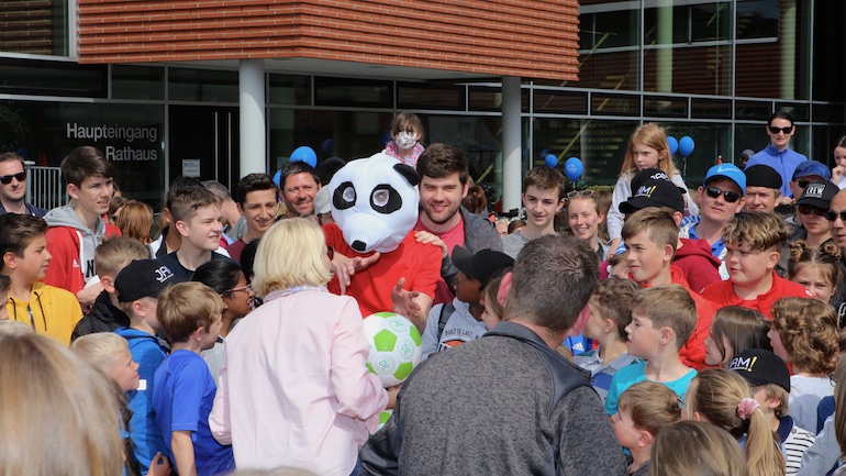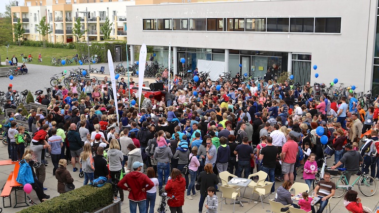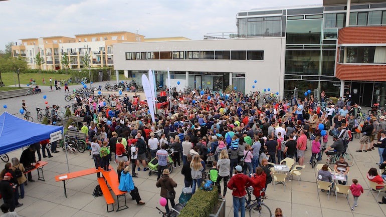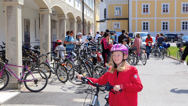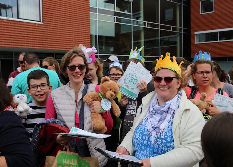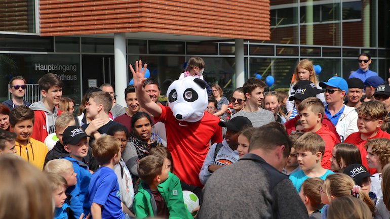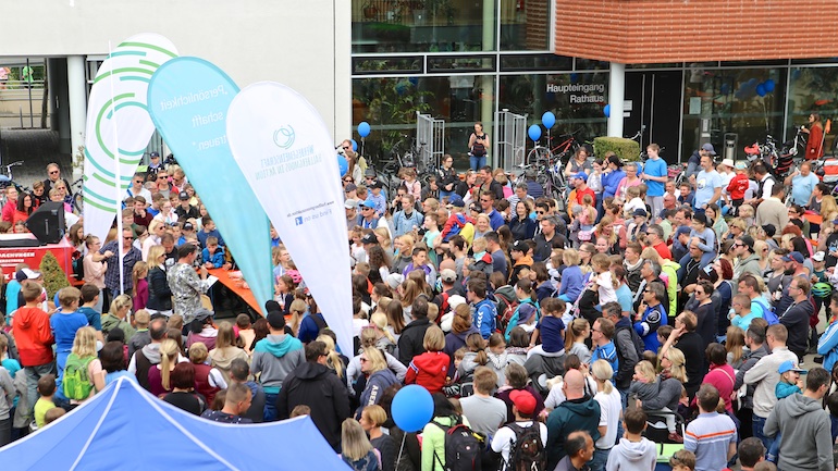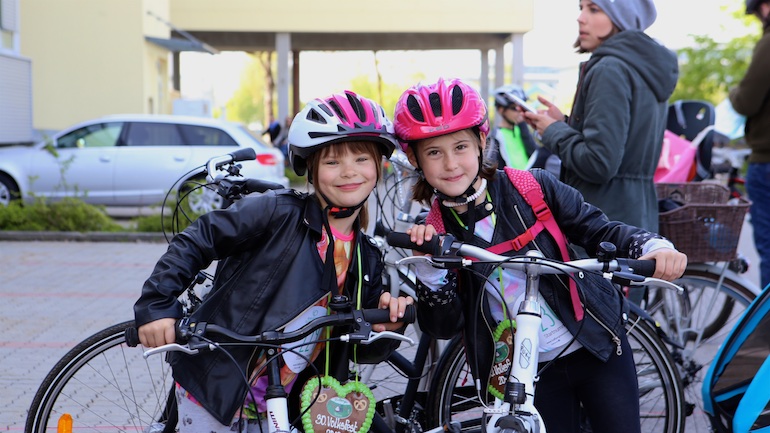 Am 1. Mai ist natürlich Feiertag, aber auch ein anderer fester Termin steht in den Kalendern vieler Familien in Hallbergmoos und Goldach. Denn immer dann startet die beliebte Radlrallye der Werbegemeinschaft Hallbergmoos in Aktion durch den Ort. Schon früh am Morgen, um 9.00 Uhr, fuhren Hunderte Radler Richtung Rathausplatz, um sich die Starterkarten und den Streckenplan abzuholen. In diesem Jahr wurden so viele Startnummern wie nie zuvor auf Rücken, Brust oder auf die Radl der Teilnehmer geklebt. Sage und schreibe 943 Radelbegeisterte strampelten dann gemeinsam durch den Ort, um die vielen Lösungsbuchstaben zu bekommen, die in diesem Jahr einen totalen Buchstabensalat ergeben sollten. Nach schon fünf beantworteten Fragen, die als Plakate an den jeweiligen Türen der aktuell 71 Mitgliedsbetriebe hangen, standen in manchen Gesichtern der Teilnehmer Fragezeichen geschrieben. Denn der Lösungssatz sollte einfach keinen sichtbaren Sinn ergeben. Die Auflösung bekam man erst, wenn im Ziel eine Schablone, von den Vorstandsmitgliedern der Werbegemeinschaft, über das Durcheinander an Buchstaben gelegt wurde. Insgesamt 943 Mal kam dann der Satz „Alles Gute zum Dreißigsten“ zum Vorschein. Über den ein oder anderen kleineren Schreibfehler sah man angesichts des großen Jubiläums der Werbegemeinschaft Hallbergmoos in Aktion gern hinweg. Denn es gab dazu ja noch ein Geburtstagsständchen der mit vielen lustigen und auch selbst gebastelten Kronen ausgestatteten Teilnehmer dazu. Auch das Maskottchen, der Hallbär, hatte viel zu schauen. Hunderte große und kleine Bären, ob angemalt, verkleidet, in Form von Gummibären oder als süße Plüschvariante gab es da zu sehen. Dies waren die drei Sachen, die man zum abgestempelten Fahrplan mit zum Rathausplatz bringen musste. Erst dann gelangten die Lösungskarten in die neue Lostrommel, die die Schreinerei Wittmann extra